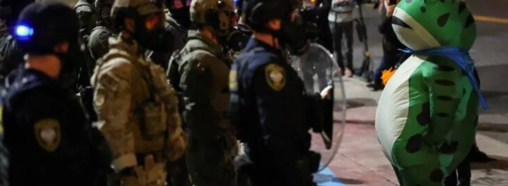 And, really, when you look at the Portland protests, it’s understandable. While a handful of people have peaceably gathered – and sometimes done the cha cha cha – on the legal side of a blue line outside the largely tranquil ICE facility since June, their forces often included the terrorist, blow-up Portland Frog, who In one recent tussle was pepper-sprayed in their vent by infuriated ICE agents. Now, the stalwart spicy Frog is back; asked about the assault in an interview, they cheerfully dismissed it with, “I kinda coughed a bit, but that was about it…Just a little pepper – I’ve tasted spicier.” At that point, a phalanx of ICE thugs emerged together and pointlessly fired off clouds of teargas toward the handful of protesters; the Frog danced and sang, “You put your left foot in…” As the troops carefully, ridiculously backed away, the protesters yelled, “Fucking losers” and “We’re supposed to love each other.” The Frog kept dancing. He also shimmied. Truly a burning hellhole.
