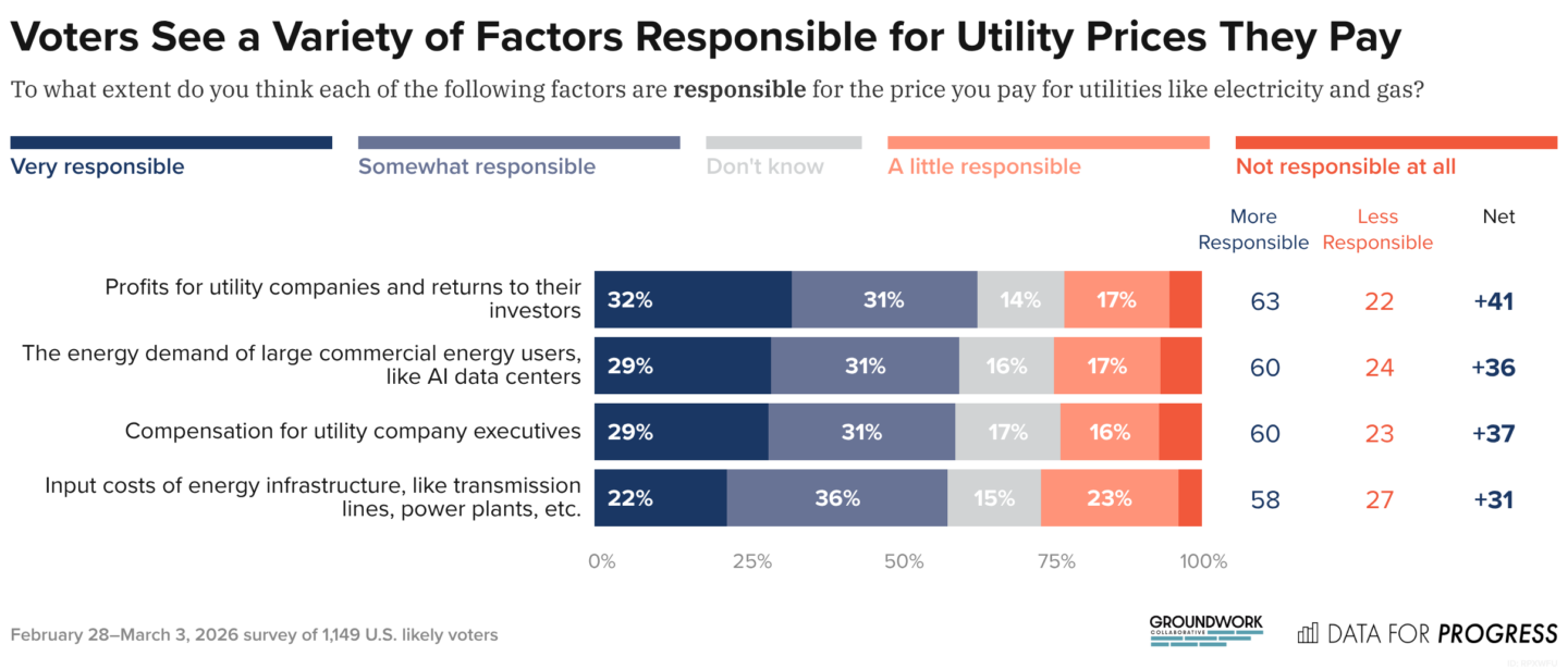 As President Trump’s escalating war with Iran pushes energy prices higher, Americans are looking for ways to keep electricity bills in check. New polling from Groundwork Collaborative and Data for Progress reveals Americans reject the Trump Administration’s plan to rely on voluntary commitments from corporate actors to lower household bills.